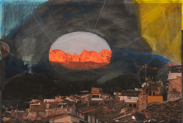 Noticias #15, 2022, ink, watercolor, chalk, pencil, photo, on print, 41 x 60 cm